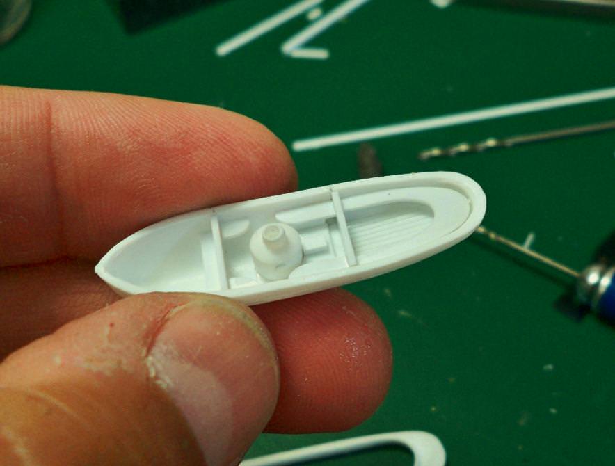 I started improvements with the interior, building up the inside space with sheet plastic bulkheads, curved bench seats, and a scribed plastic floor. Apart from the kit-provided boiler part (here minus the smokestack), everything inside the boat had to be added.