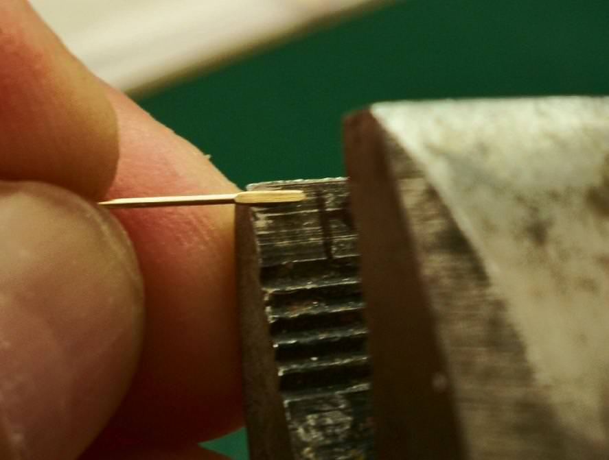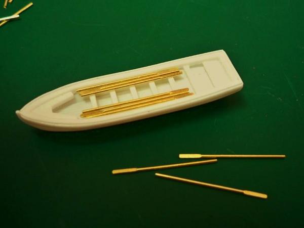 Making these new parts was pretty simple. Using Detail Associates.022 inch brass wire (#2507), I trimmed each piece to length, making blades by crimping the ends with pliers. After sanding the blade tips to make rounded edges… instant oars!