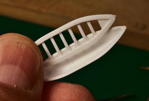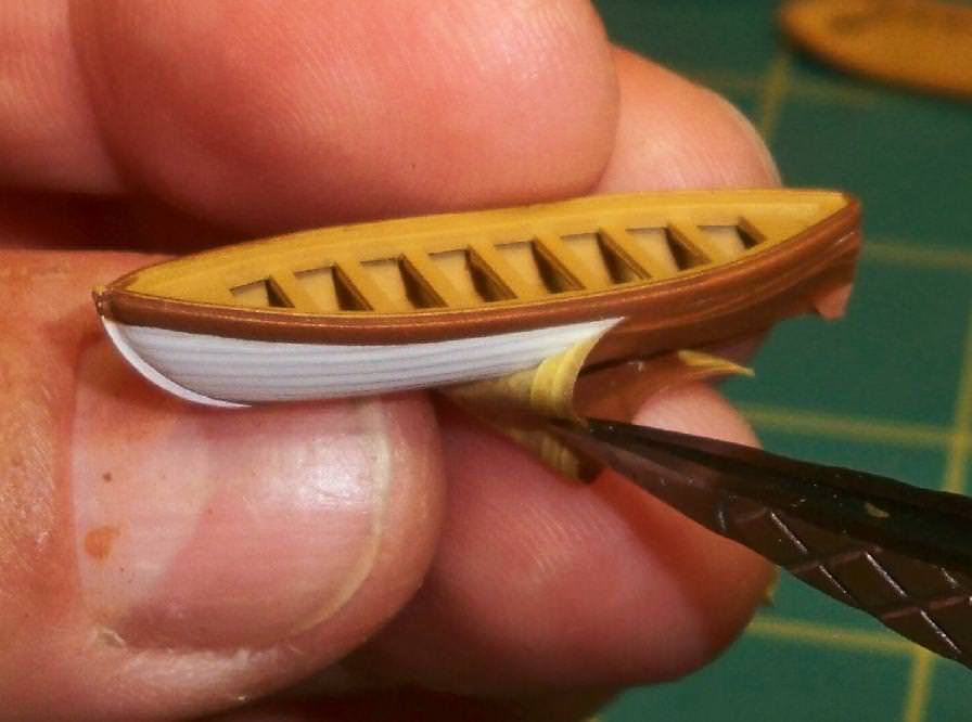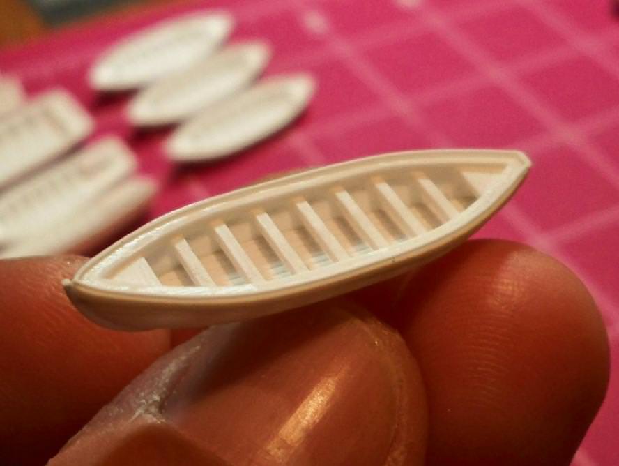 The pulling boats supplied in the kit consist of hulls and thwart/gunwale parts, plus separate stacked oars. The completed assemblies look reasonably good right out of the box, with accurate shapes and even some nice planking detail on the outer hulls. Still, since all those boats will be so prominently perched atop the superstructure, I decided to improve them.