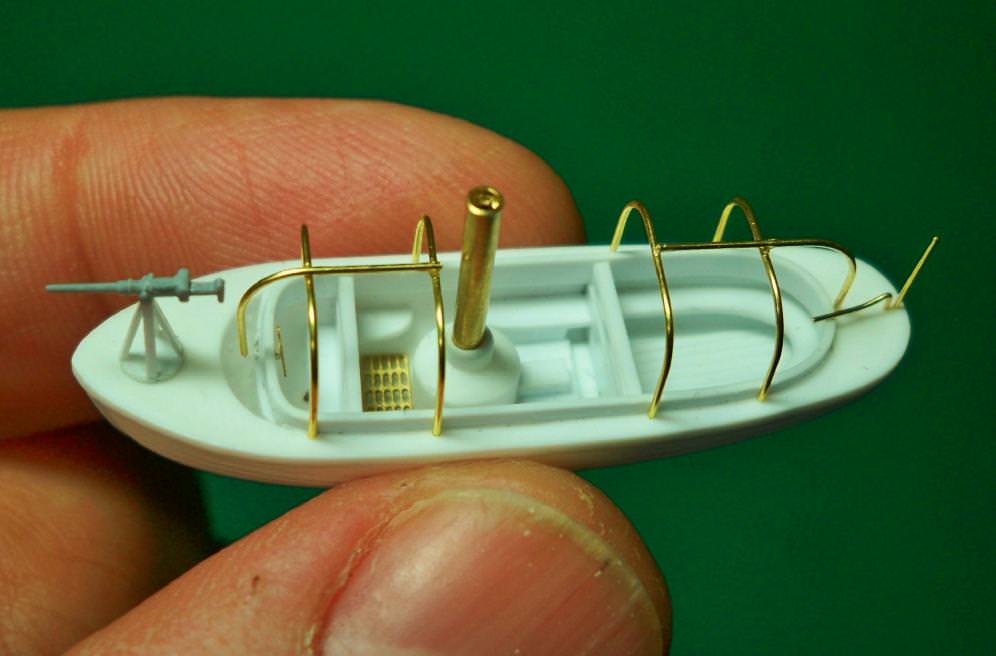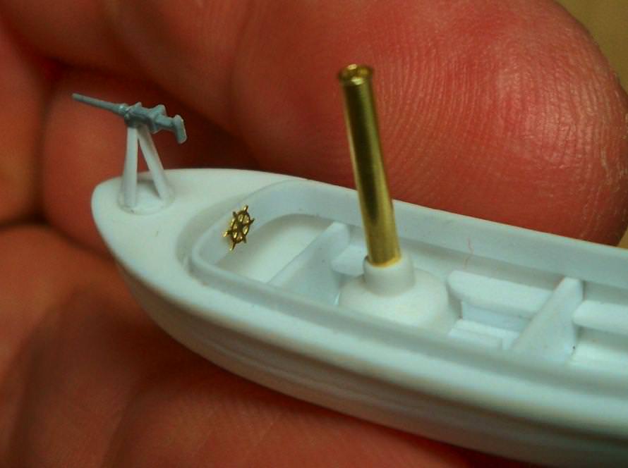 The goofy looking steam launch carried a formidable looking 1-pounder gun on its foredeck. I assumed the gun would have been removed and stowed when the boat was secured on board in its cradle, but contemporary photos show that the gun was left in place. So much the better for me, as it makes the little launch more interesting! The 1-pounder gun was copped from my derelict 1/350 scale Varyag kit and attached to a mount made from plastic strip. The miniscule helm came from White Ensign Models “1/700-1/350 ships wheels” brass photoetch (set #PE 736).