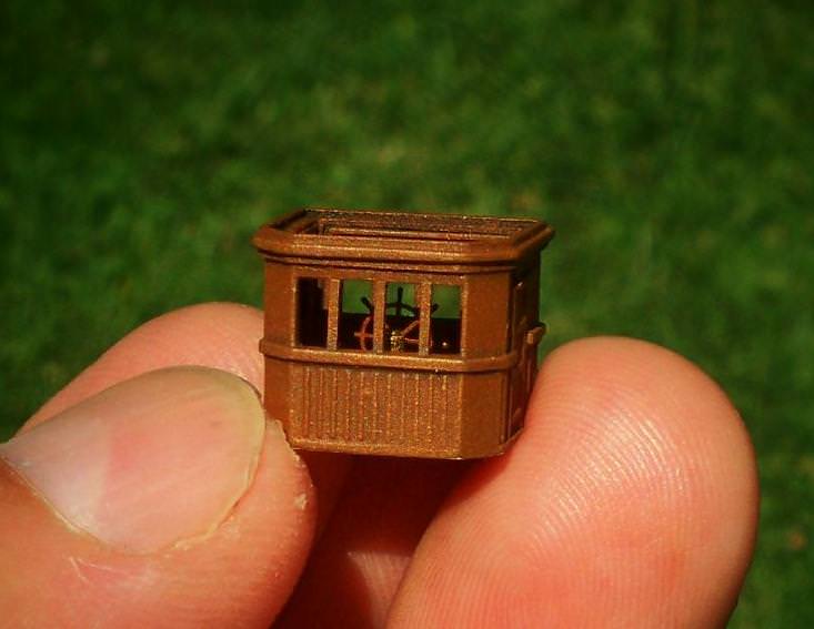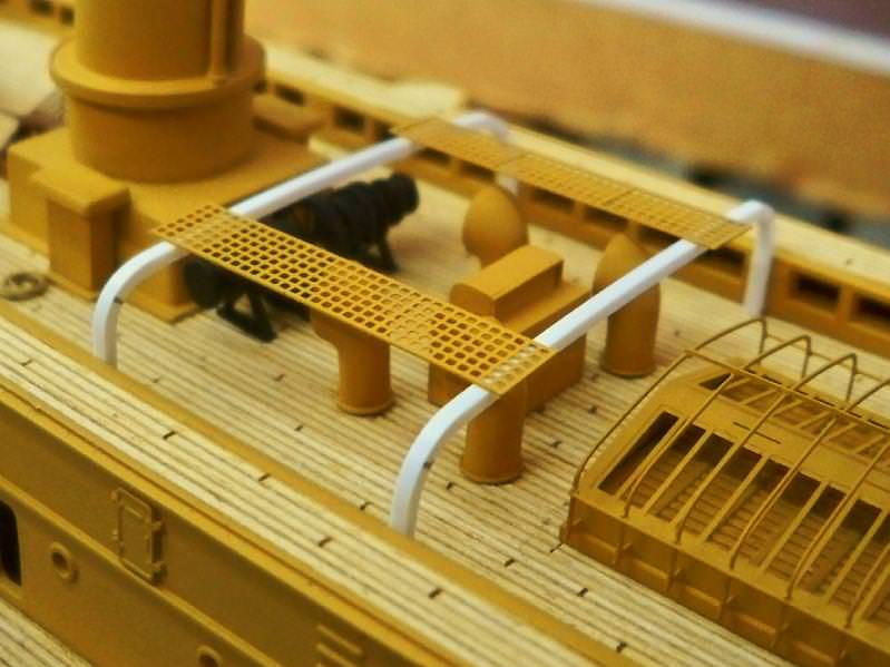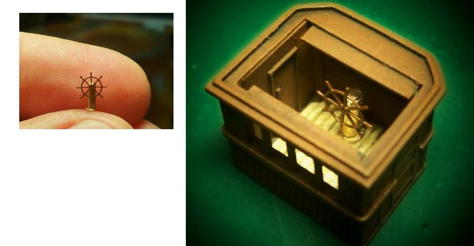 Sunshade frames were fabricated from brass wire, as were the tiller and flagstaff. A small floor grating was a photoetch bit cut from the Gold Medal Models N-scale tank car walkway grate set (#160-23) which had also contributed parts for Olympia’s windlass assembly earlier.