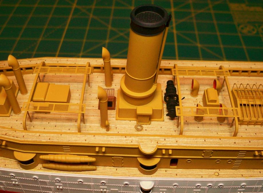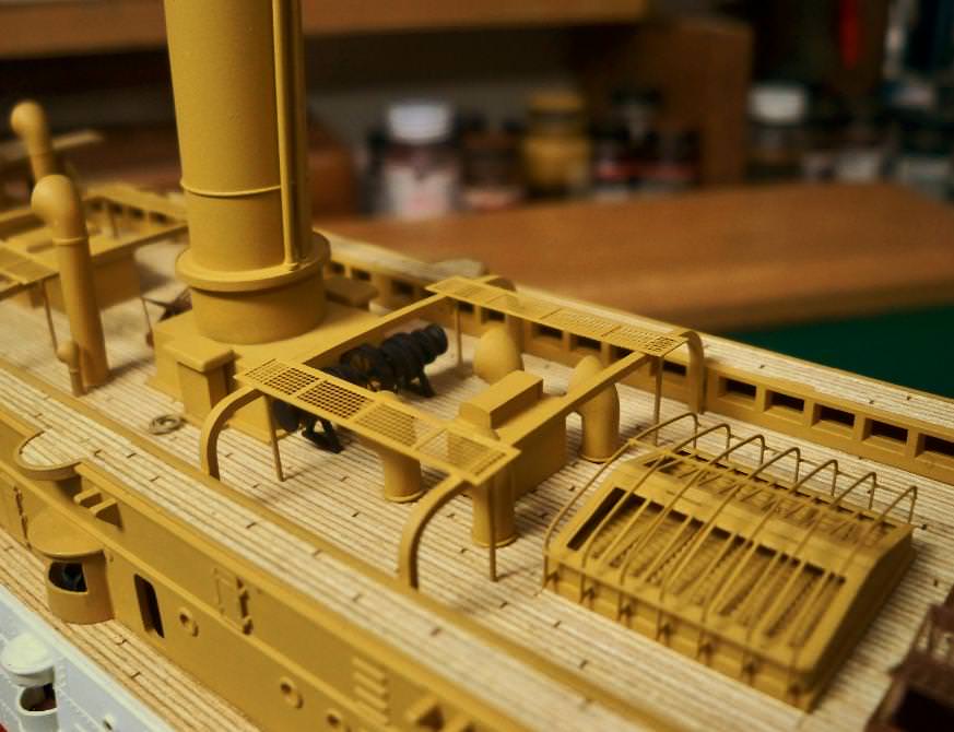 The first change was to install wood decking inside. I had initially intended to paint the inside deck maroon as in the museum ship, but after painting the brown of the structure it ended up pretty dark in there. So I opted instead to use a lighter look to help make detail a little more visible in that dim interior space.