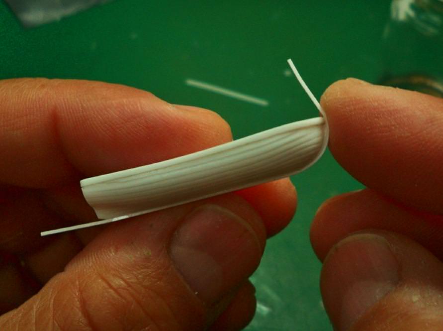 Another weak area of the boats was the keels, which were only rather vaguely depicted on the kit parts. After scraping away Revell’s molded representations with my X-acto, each boat received a new keel made from Evergreen .015 X .020 inch plastic.