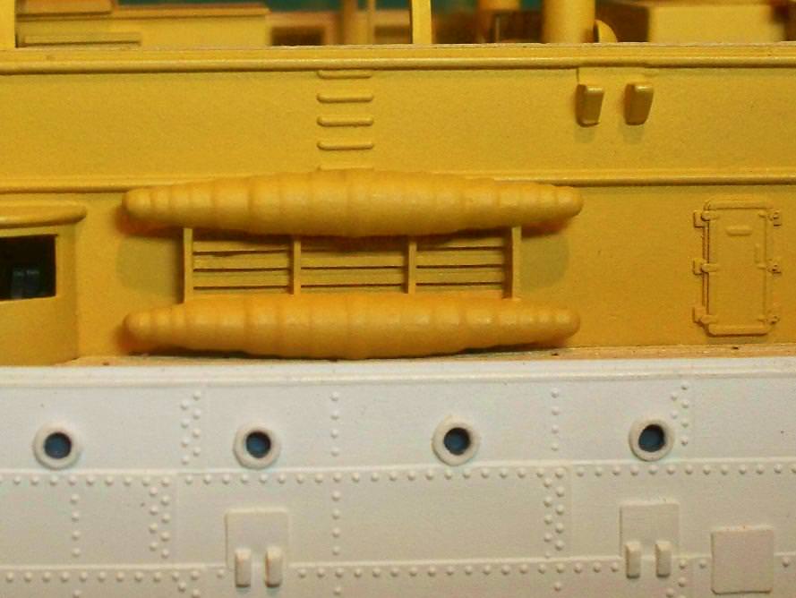 Test fitting the pulling boats on the racks, they look good... but unfortunately they are packed so closely together that they also conceal details on the superstructure deck below. The main water tank/vent box, for example, for which I had scratchbuilt a more accurate replacement—