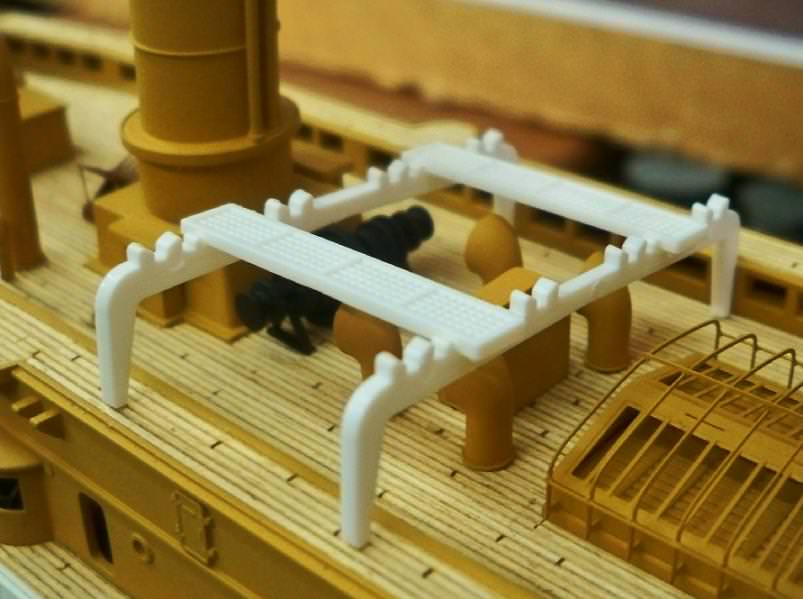 Too late to adjust the superstructure, I built up new, slightly narrower racks from .040 X .040 inch Evergreen styrene strip instead. Photoetch mesh working platforms came from the Gold Medal Models Olympia set.