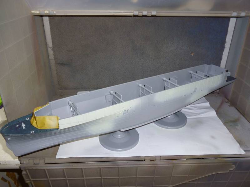After all that PE bending I finally broke the code for Life Color paints and sprayed the first colour of the camo scheme on the hull successfully.