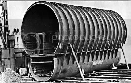 Transport of different sections by means of the use of pontoons, above is seen since they are being raised the section of This prow it corresponds to a long shot of a type the XXI