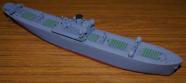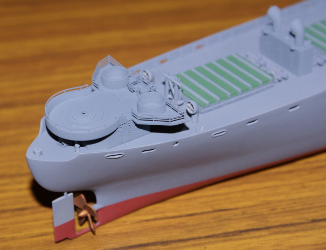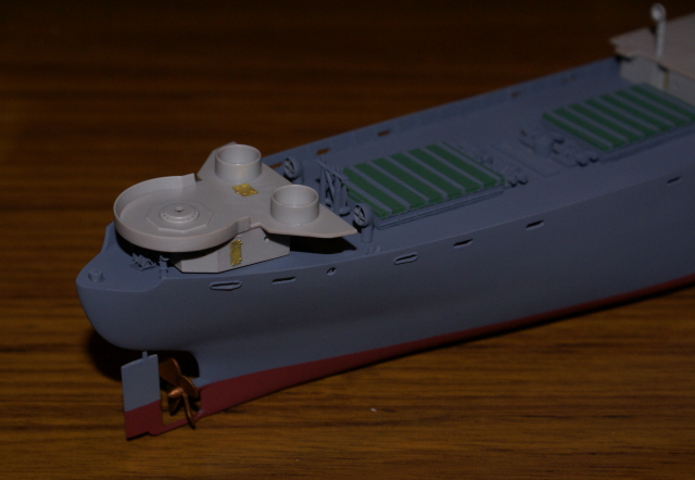 Slight oversight on behalf of myself here. I forgot to remove the moulded on ribs (just visible forward of the cargo hatch) which trumpeter added to locate their plastic ladders. I should have removed them prior to painting, but have now had to remove them and touch the area up with paint via a brush. Here's a shot showing them prior to removal.