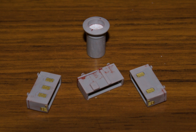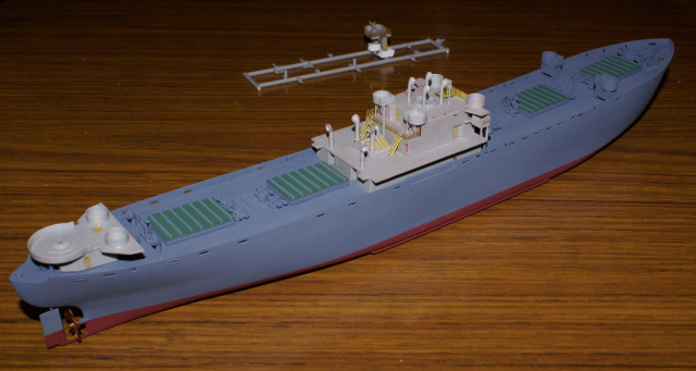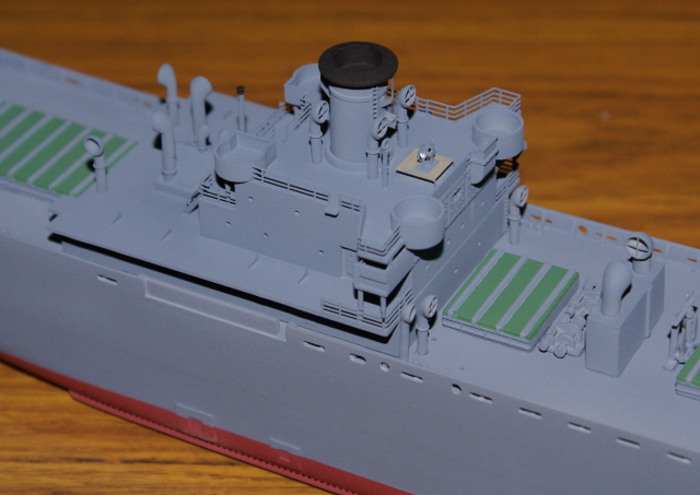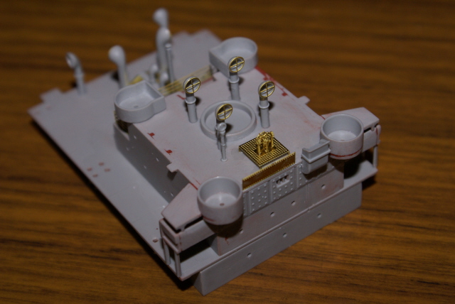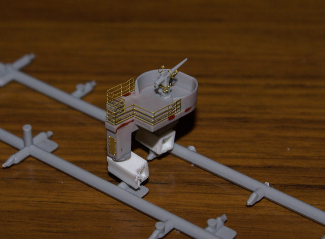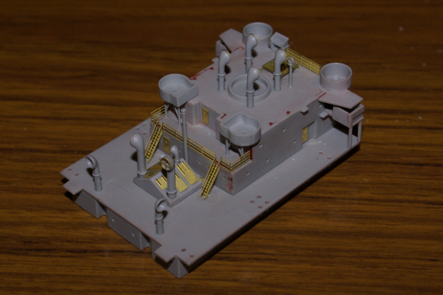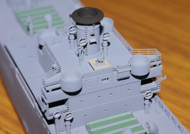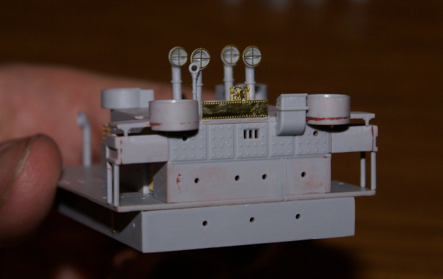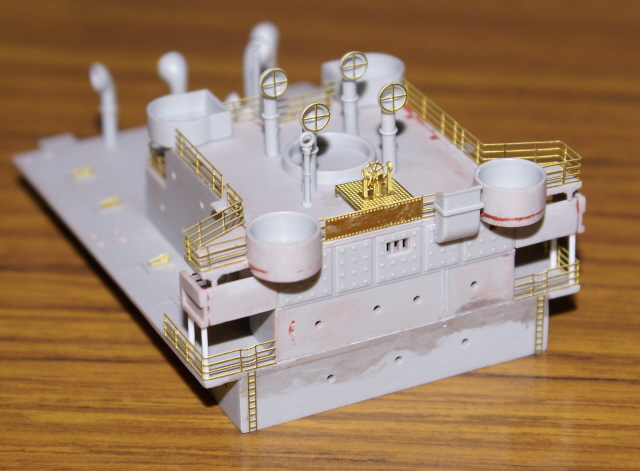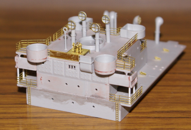 Having now painted those sub assemblies I've been able to add the bridge assembly, mast houses, and rear gun platform