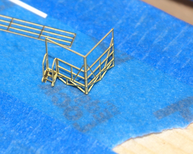 With the original posts removed from beneath the bridge wing cabs and news styrene rod posts added I was able to add the PE railing around the front and side of the boat deck.