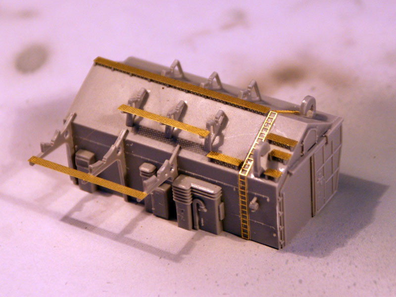 OK, I have been working on the two separate hangars on either side of the funnel - but I want to make one of them open - I have only seen one photo showing the doors opened, and I have a pretty good idea what the doors do - but the plane obscures the top of the hangar, so I only have some details.