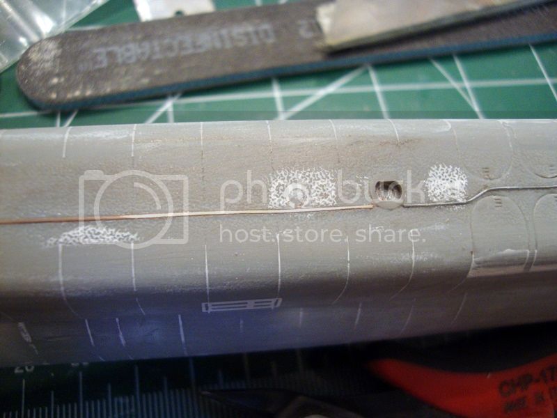Getting closer...Worked on getting the tag line to look a bit more the part. I fit a strand of wire into the trench that went down the middle of the boat and then sanded to top flat.