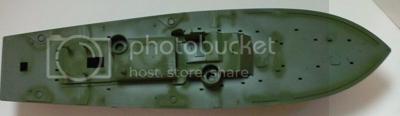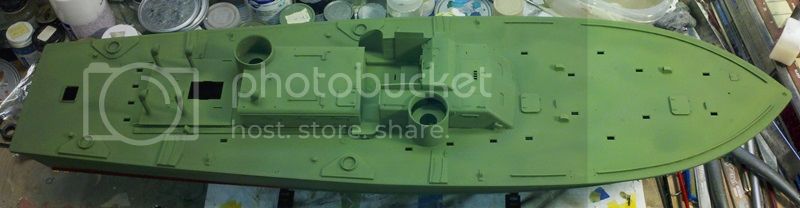 I used a basic Krylon dark red under the hull and Tamiya's XF-67/TS-61 NATO green for the overall color.  I've attached a few basic items to the deck and the deck to the hull for the spray painting, will probably airbrush the rest.  I also painted the inside of the hull and superstructure parts black as there's nothing to see through the ports.