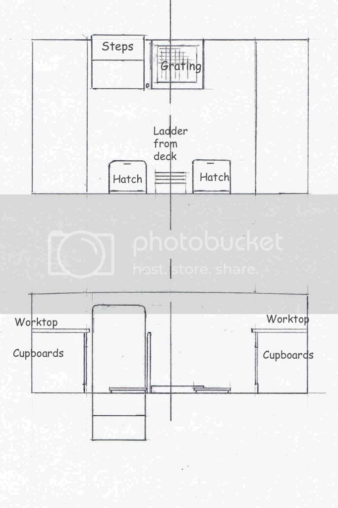 The side cupboards are depicted as going straight up to the deckhead, there is clearly worktop above. The section drawing shows on the right a deeper drawing which I would take to be for charts, chart table above?