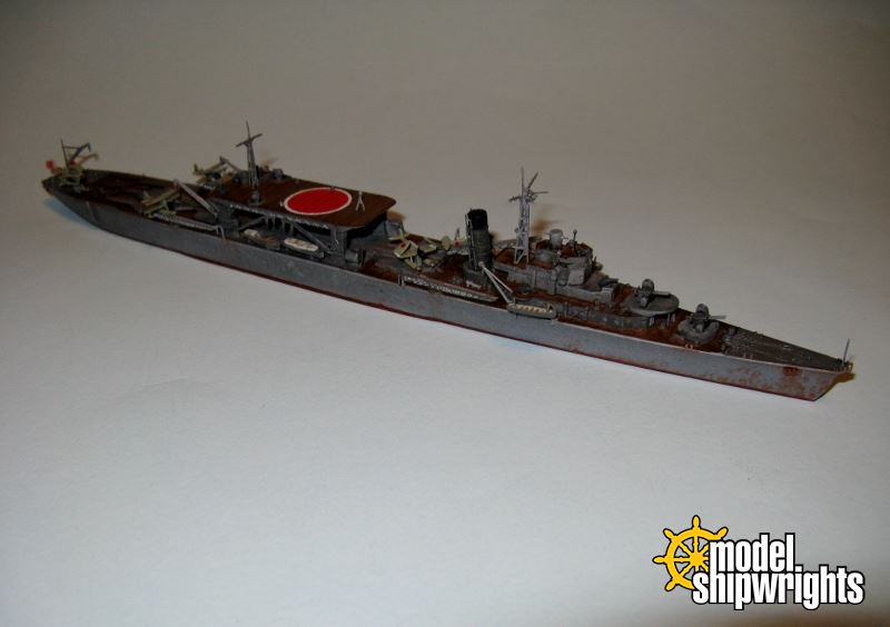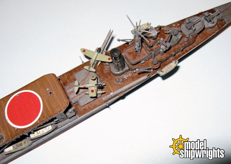 I will post a few more images in a few days but otherwise, this build-review of Aoshima's Chitose kit is complete. One change to the ship is that I noticed transverse bands between the aircraft handling rails. HA! said I, those must be the bands separating linoleum anti-slip, so I painted them with linoleum color. Then I noticed that is how Aoshima painted the display model on their website.