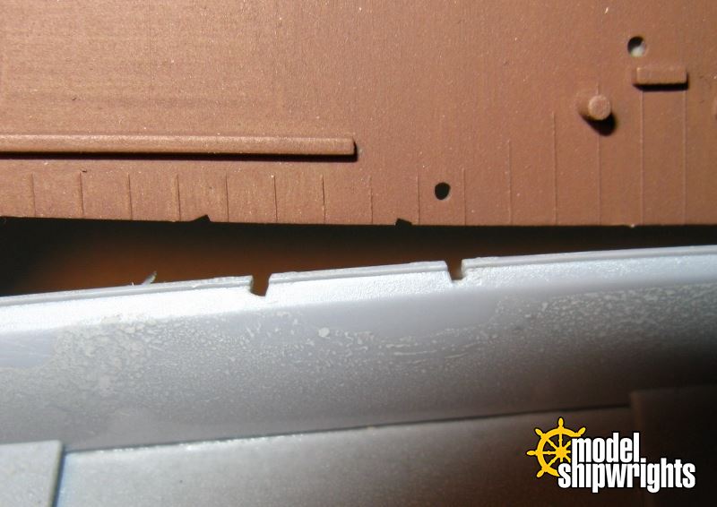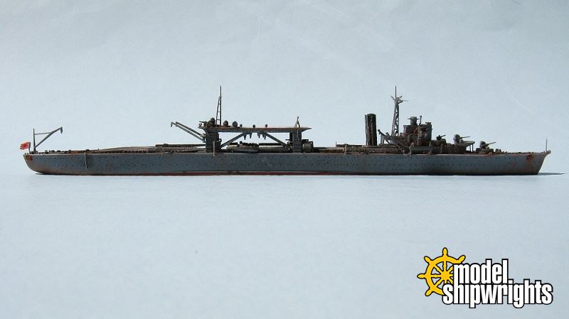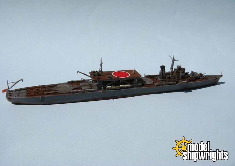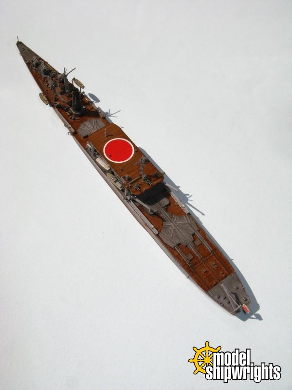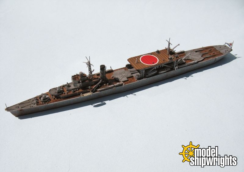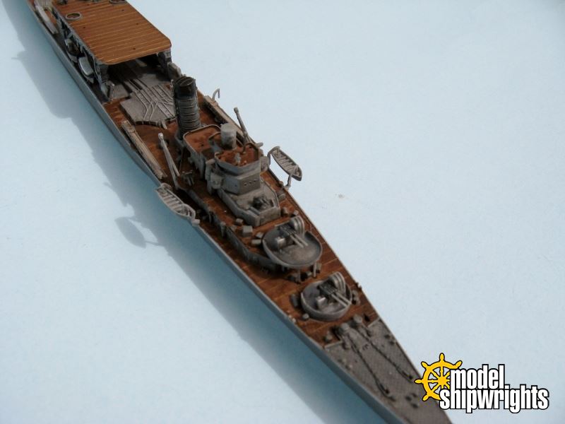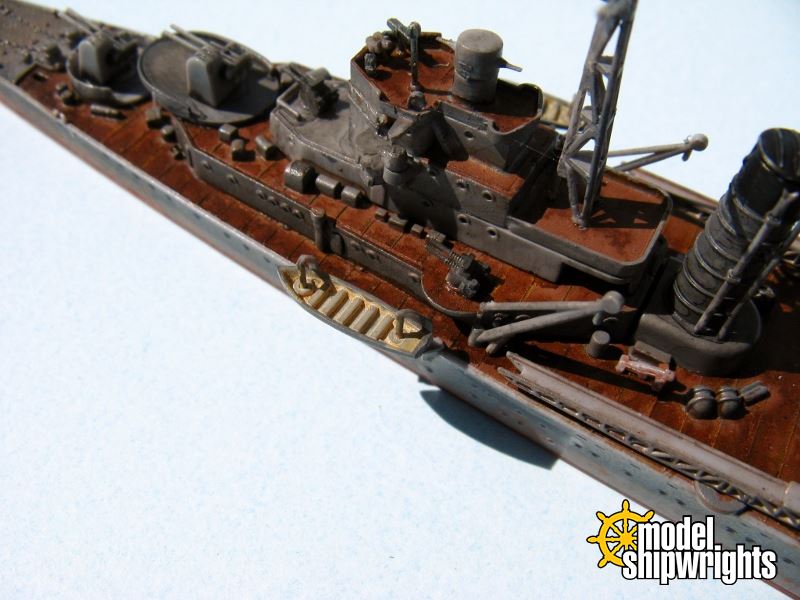 The Type 89 guns and mounts have been installed so I mounted the 25mm AA guns on the forecastle along with boom cranes. This is also when I attached the davits holding the 9m cutters to each side of the gunwales. These davits have generous tabs which fit into slots molded into the ship sides and weather deck.