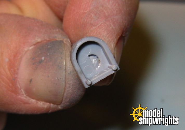 Next I moved up to the top of the superstructure to the flying bridge and finished adding the very tiny items (pelorus & binnacle?), including the searchlights. Just how small are those pieces? Take a look!