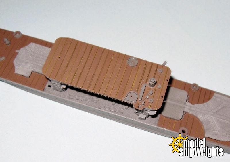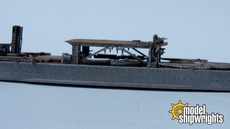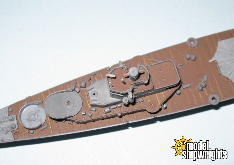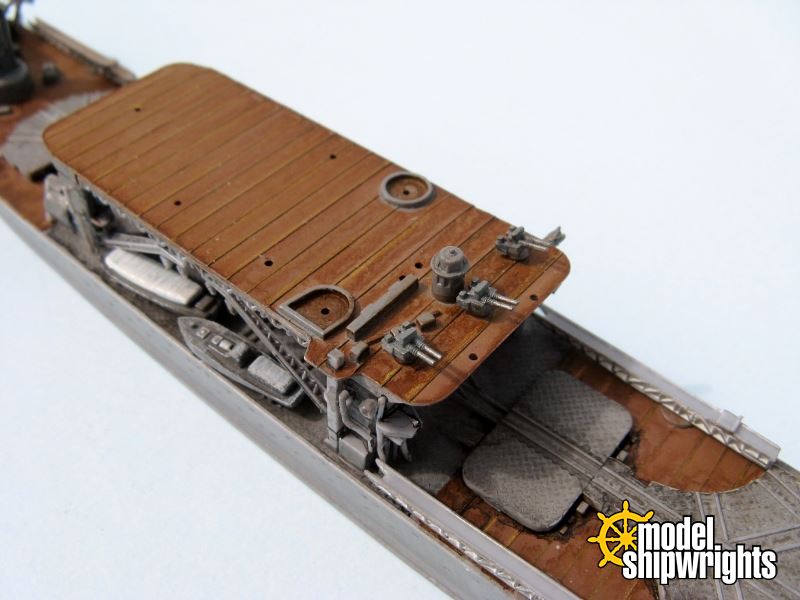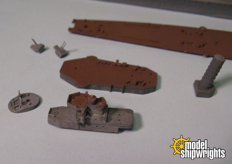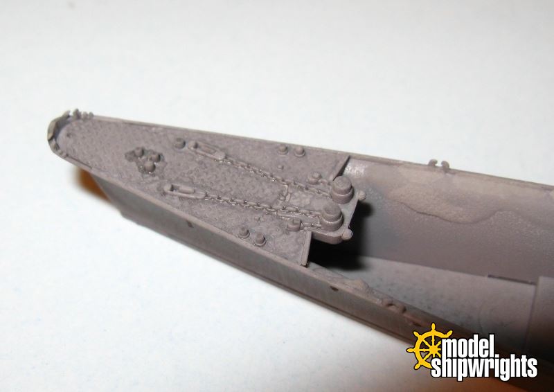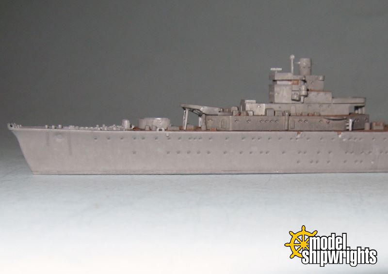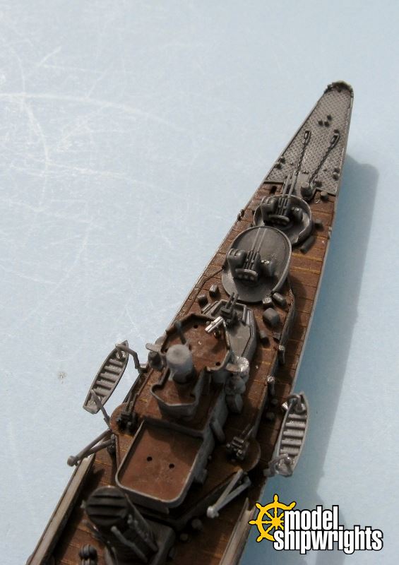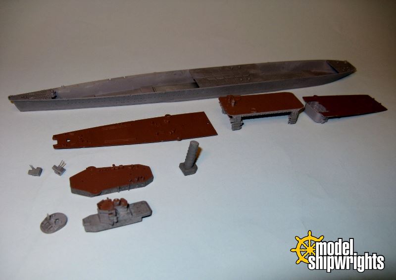After the towers and elevated deck are attached, the major ship structure is complete. Now comes the “fiddly” parts. Cranes, catapults, antennas, parevanes, light flak guns, masts, search lights, launches – dozens of items.