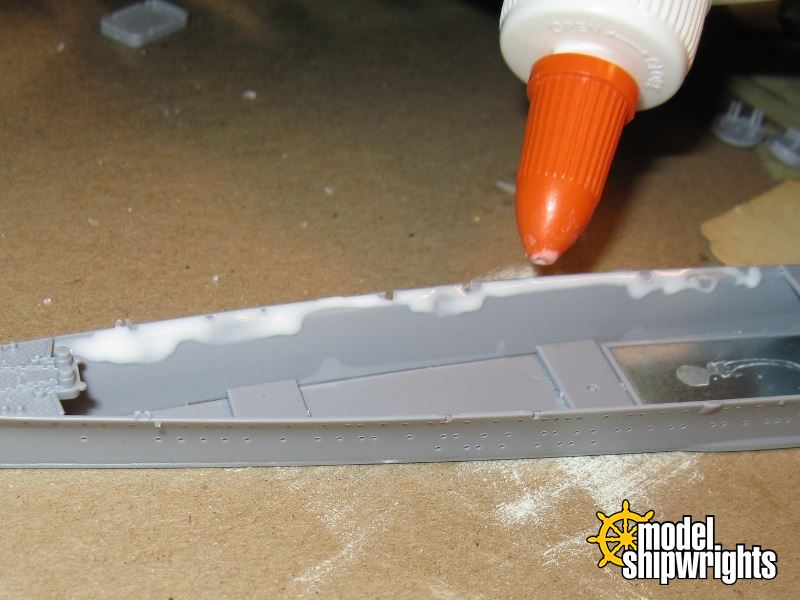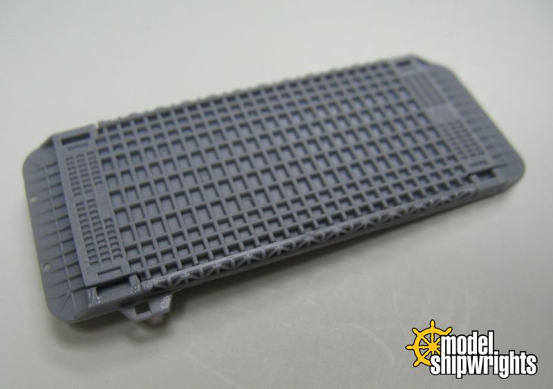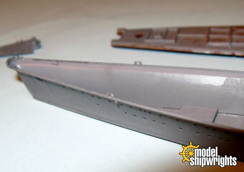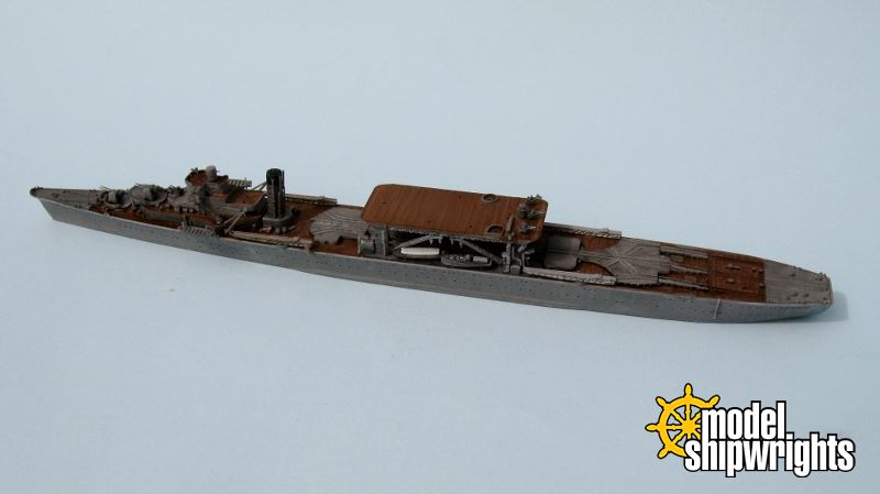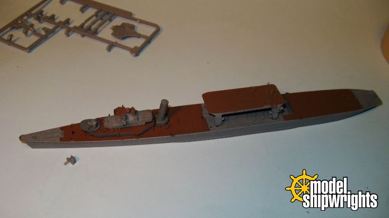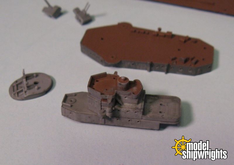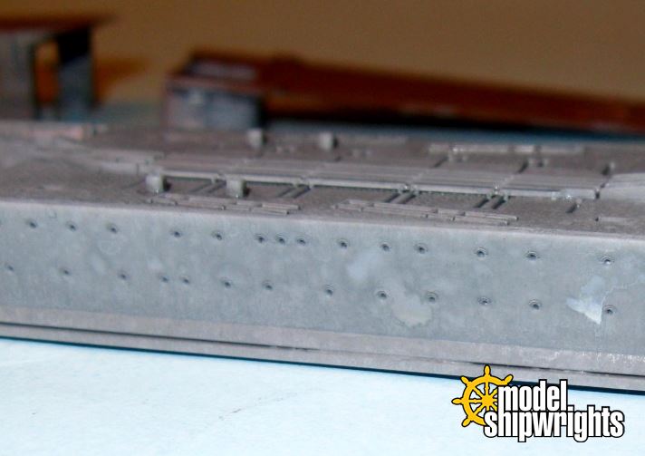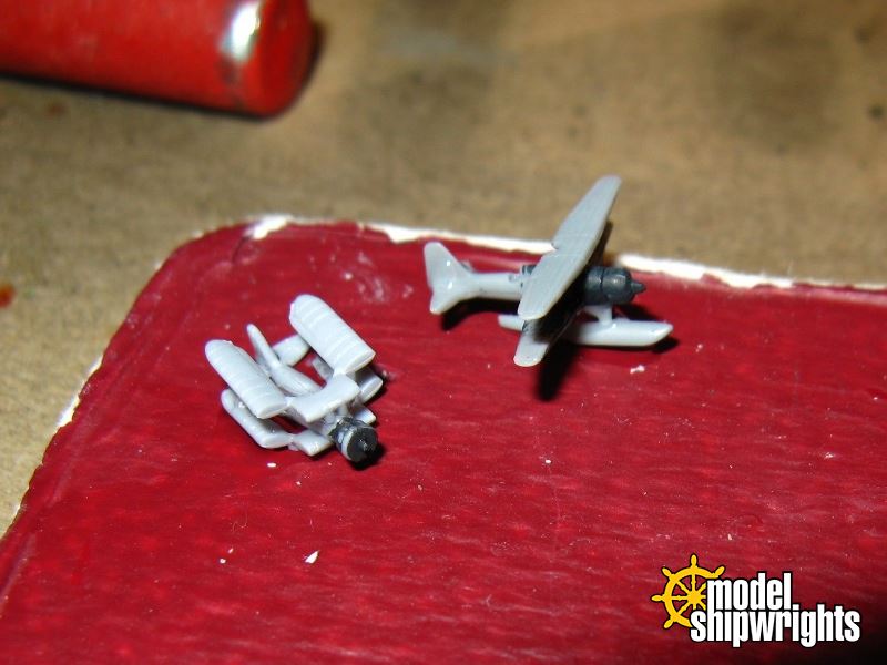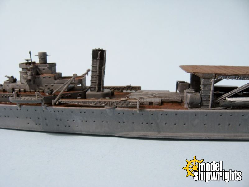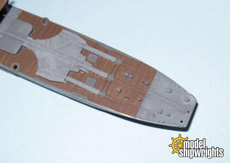 After the towers and elevated deck are attached, the major ship structure is complete. Now comes the “fiddly” parts. Cranes, catapults, antennas, parevanes, light flak guns, masts, search lights, launches – dozens of items.