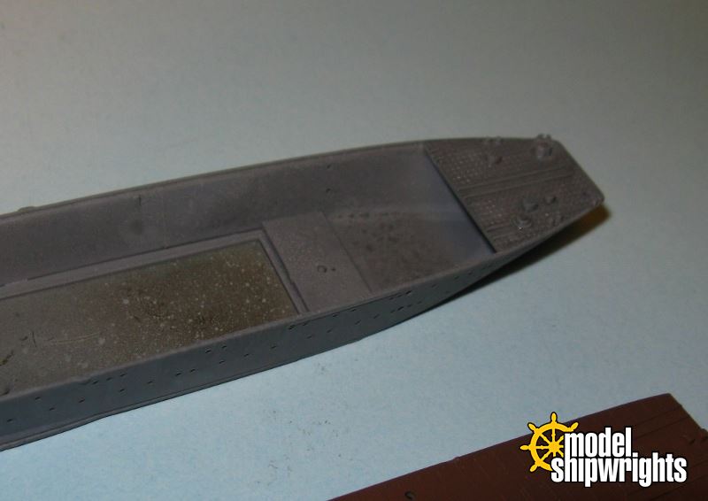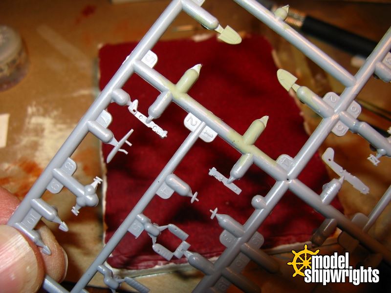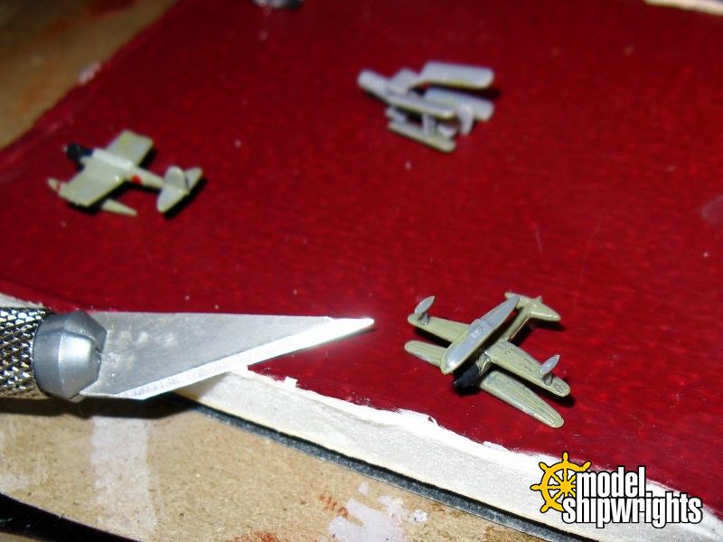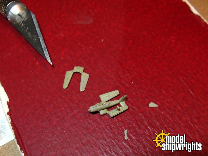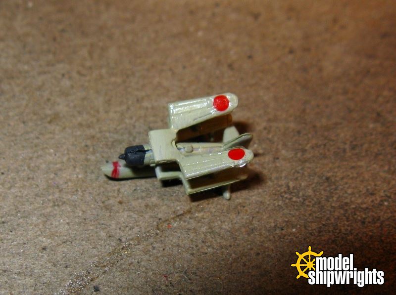 Before adding the parts atop the elevated deck I attach four widely spaced davits. These have no slots to mount them into. Almost imperceptible marks are molded on the ship sides below the gunwales. One must simply glue them and attach them butt joint style. They are very small parts. I lost one while cleaning the sprue burr from it. Thus, I did not de-sprue the other, instead I used two different davits from another it. These four parts are spaced wide enough that handling the model is not risky, just in need of awareness. You can spot those little rascals in this dive bomber-view.
