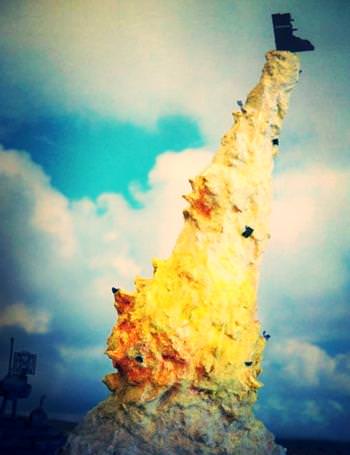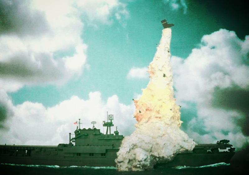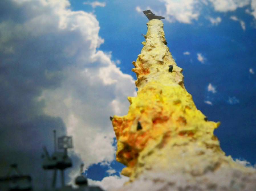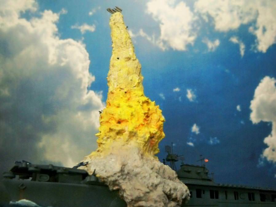 I had initially thought to set them at some distance from the explosion column on little wires, but this didn’t work very well at all, so I settled for attaching them to various spots on the plume itself. They aren’t as numerous as those in the original strike photo, but they do help suggest additional damage from the explosive power of the blast.