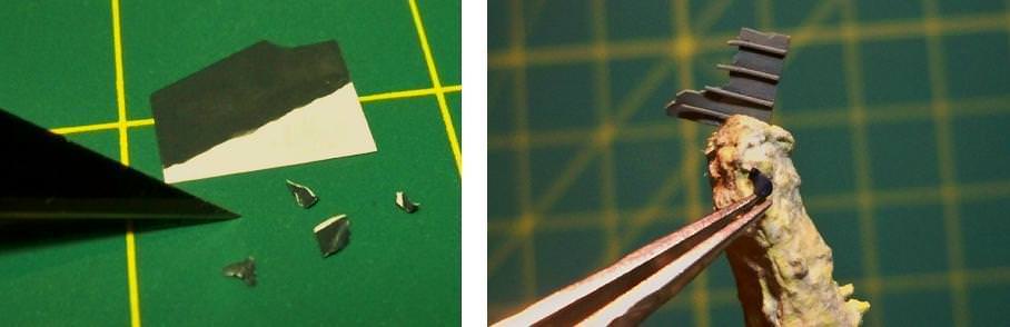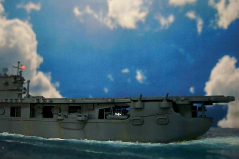Now that the explosion plume was painted and secured to the ship, I attached the broken elevator to the top of it to match the famous photograph. I liked the effect, but the photo also shows numerous other, smaller, fragments being blown into the air along with it. To replicate these I painted a piece of .005 inch plastic sheet with the same White Ensign Colourcoats 5-N Navy Blue enamel as the ship and tore off a number of jagged fragments with a pair of tweezers. After touching up the torn edges, I attached them to various points on the plume.