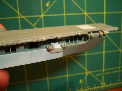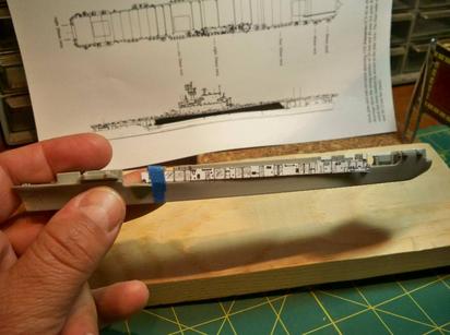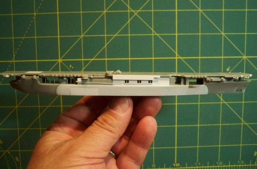 The bulges extended from nearly the keel through the hangar deck level on both sides. I simulated these on the model using .010 inch Evergreen plastic sheet. The stark white sections seem pretty conspicuous at the moment, but they should blend more smoothly into the hull once I get her painted up.