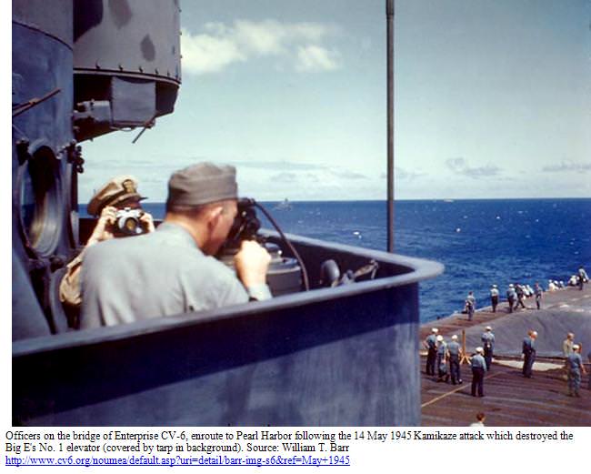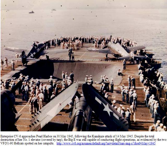At the time when the instructions were issued 26 Feb 1945, Enterprise was mostly at sea, deeply involved in the intense operations leading up to the anticipated final invasion of Japan. Reviewing the Enterprise’s yard record around this time, she spent two days at the advance base at Ulithi Atoll in early March 1945, 10 days at Ulithi in late March/Early April to repair extensive 20 March friendly fire damage, and 3 weeks at Ulithi to repair damage from two 11 April Kamikazes. She sortied again on 3 May 1945 and was at sea until the 14 May Kamikaze hit that put her out of the war for good.