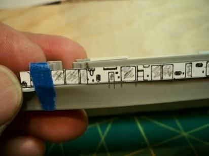 So now that I knew the hangar doors needed to be open I had to do something about those plain solid sides.  My first thought was to simply paint the locations of the openings black to suggest open doors, but even in this small scale that would not be very convincing; the doors had to be opened up. To get an idea of the location and size of the doors, I cut out a section of Enterprise plans I had reduced to 1/1200 scale and taped it over the side.