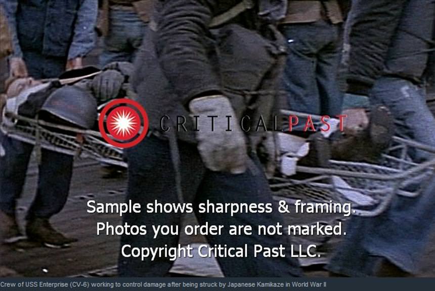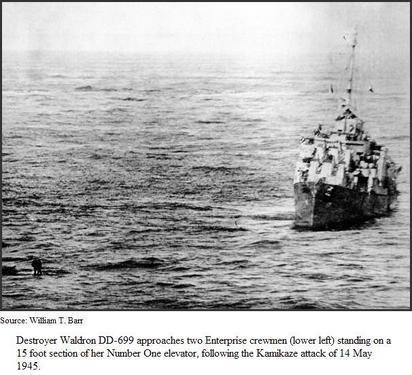 The force of the explosion blew several crewmen off the ship and tore the elevator apart, sending it an amazing 400 feet in the air. More amazing still is that the Enterprise’s forward elevator still had one final function to perform after it fell into the sea: