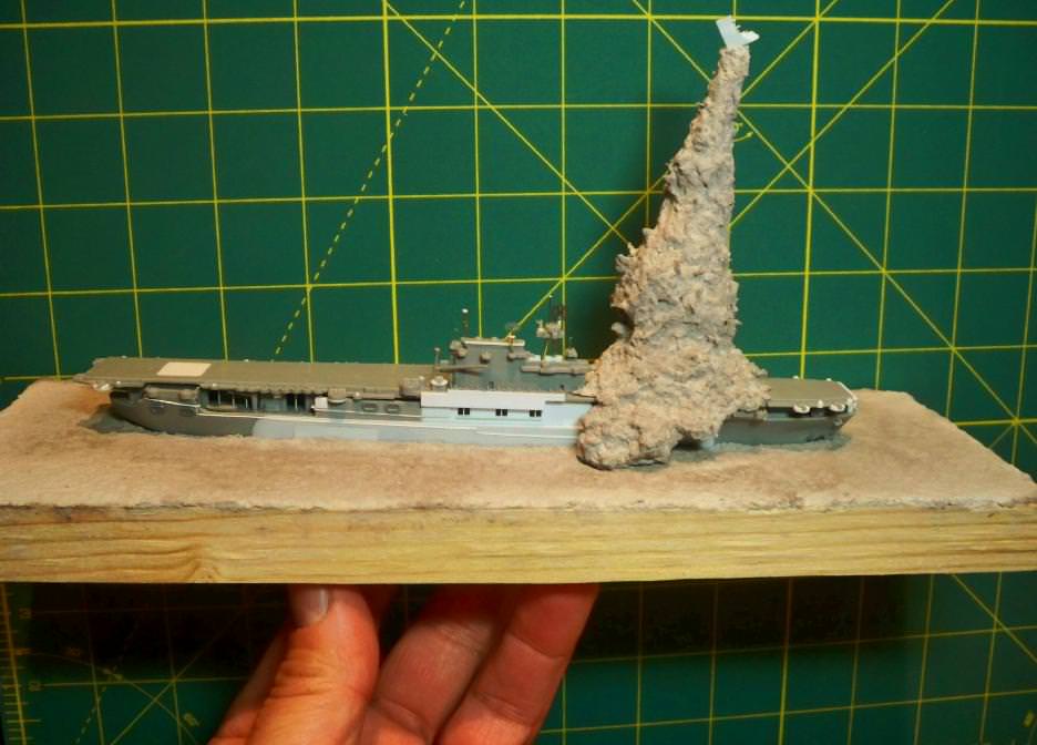 The last detail to build before painting was the shattered forward elevator at the top of the explosion plume. I made this from.010 inch plastic sheet following the shape in the photograph. The “underside” of the piece was adorned with a simple support girder framework made from .010 X .010 inch strip.