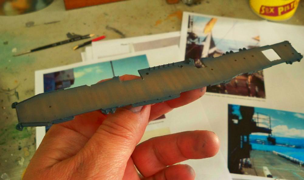 When I did my 1/700 ESSEX hasegawa, it too had no hangar deck so I scratchbuilt one. That way I could park a few planes near some of the open doors. I also lighted the interior with grain of rice size bulbs. Took some time, but the extra effort was worth it. I used some styrene sheets that looked like mini corrugated roofing to fabricate some of the doors with, as many times some doors were closed, some open and some in various positions in between. Mostly for ventilation, as the hangar bay gets very nasty when they test fire those gasoline engines on the old aircraft in there. Just some ideas.