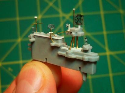 The island received  new brass masts, yards, and  tripod supports for the tower. Stainless steel photoetch radars were adapted from an older Gold Medal Models 1/700 scale USN Cruiser/Destroyer set. Although excellent, older (in this case early 1990s) photoetch sets were not quite as finely etched as they are today, which actually works better alongside the clunky detail on this very basic Enterprise.
