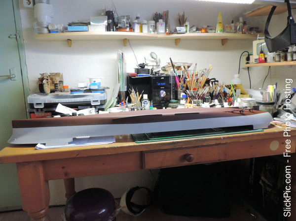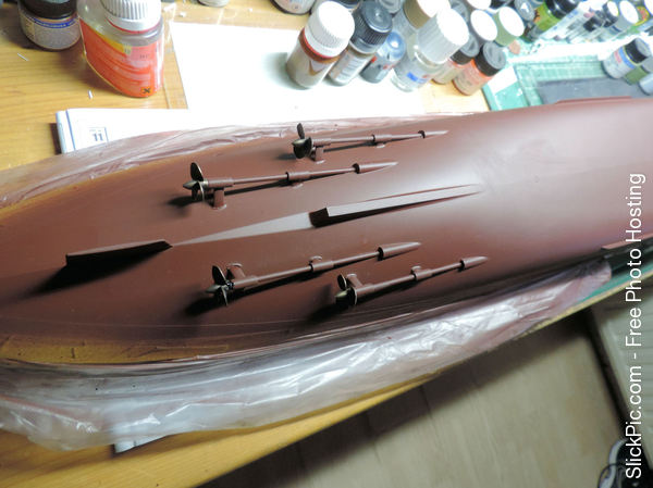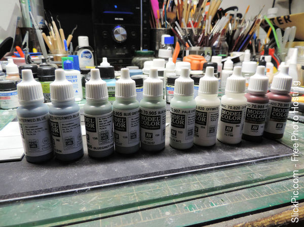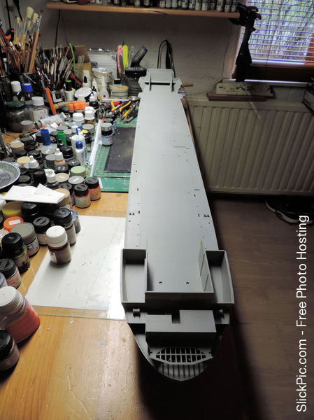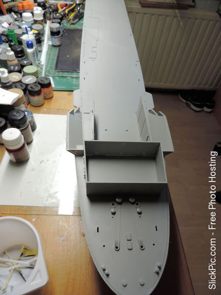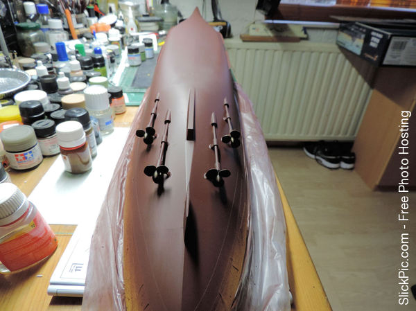 Filling up the ejectorpin marks on the forward elevator shaft. A hefty construction that shows how big those elevators were in reality. Also blackening the shiny gold anchorchain with the "Uschi von rosten" blackening liquid which I can thoroughly recommend. Capstans, bollards etc. starting to show up on the focsle- and poop deck. I bought what I thinks should be the necessary paint for the Hornet. I have deliberately bought a shade lighter of most colours because the recommended Vallejo paint looked too dark for the model: