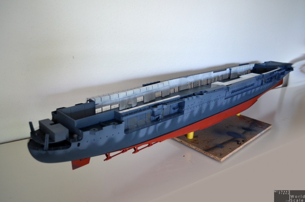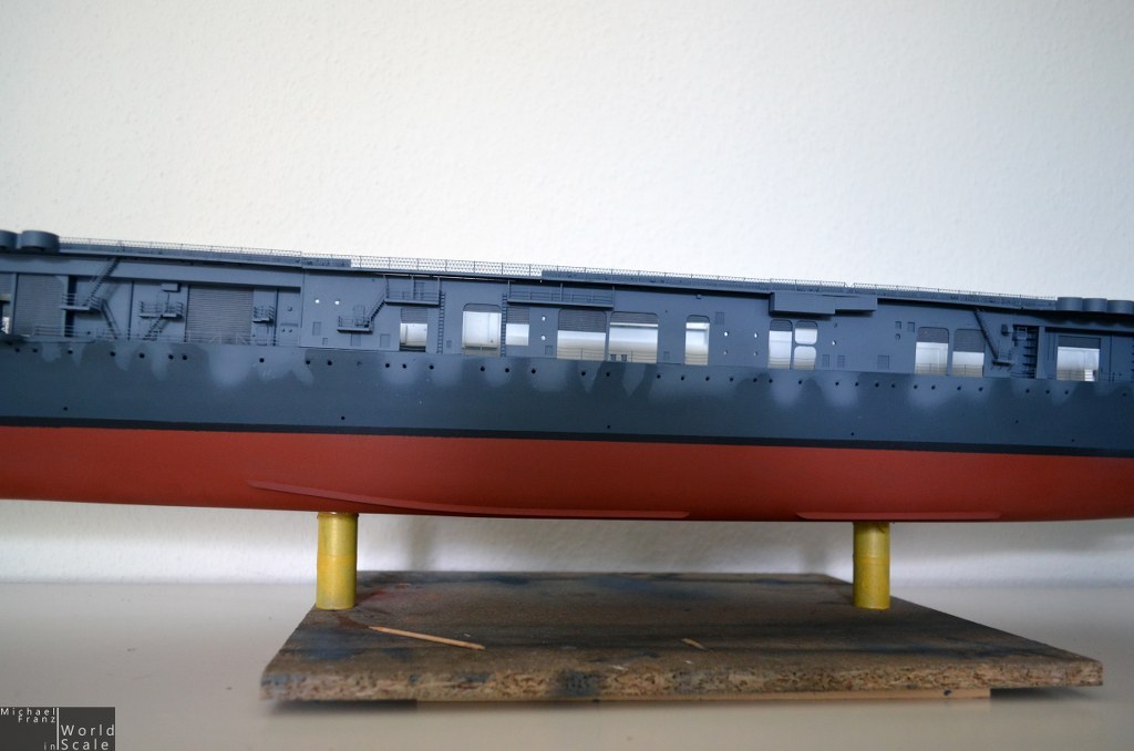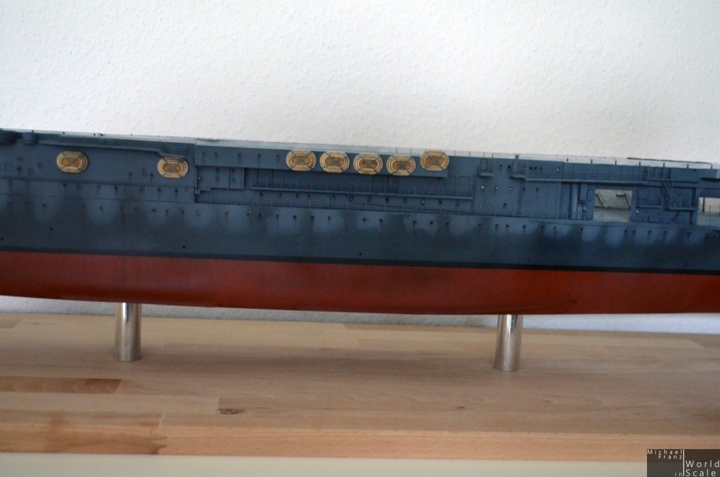 The Nautilus Models wooden deck is painted in deck-blue firstly, then glued on the plastic deck which was painted in hull grey first. After that the complete deck is mounted on the hull. Here I had some smaller sanding and filling works on the finished paint.... no fun, but we made it. After that I have masked the deck for the markings which were brush-painted on the deck. After that a black oil color washing followed, then I have sanded the whole flight deck wo get some scratches and a little bit of wood visible under the colors. A final layer of dark brown oil color washing finished the deck for the moment.