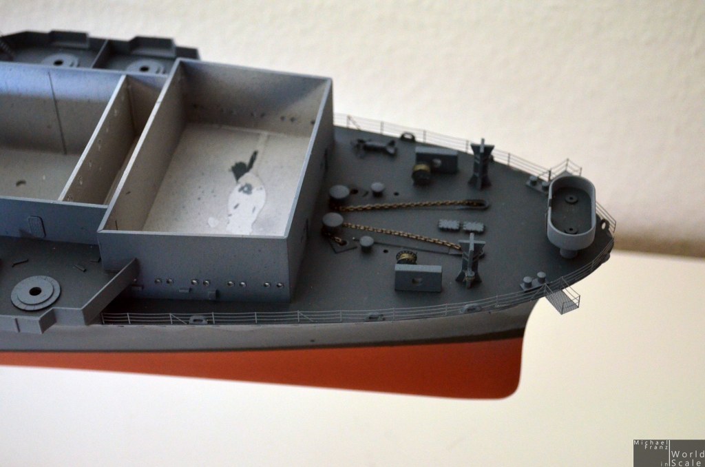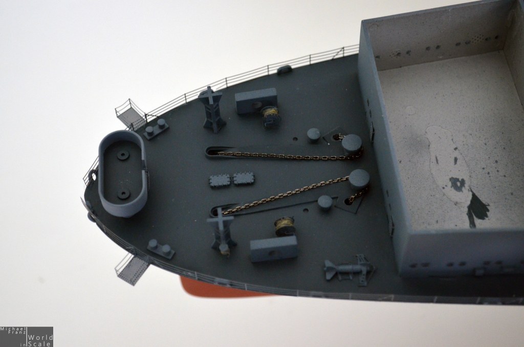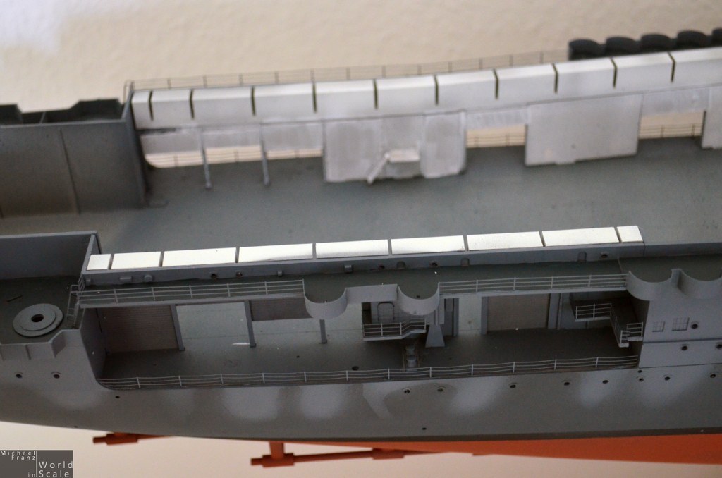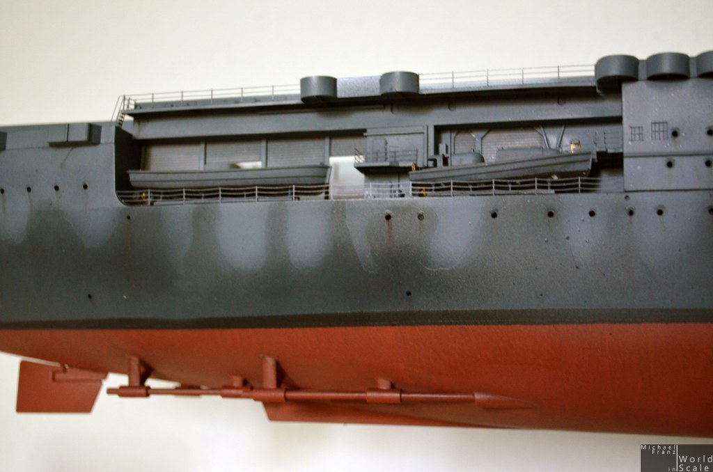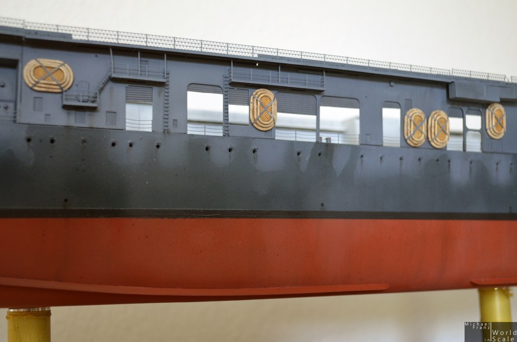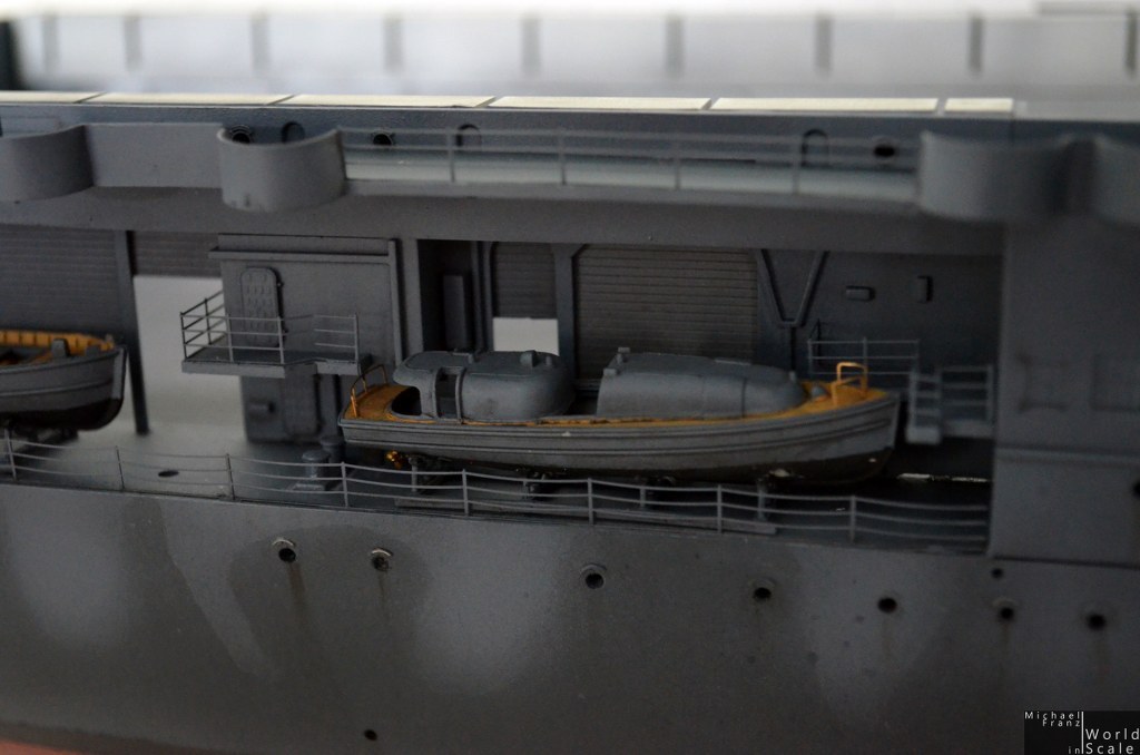 The small boats were put together, added some PE-parts from Tetra, colored, oil color wash, and installed at their places.