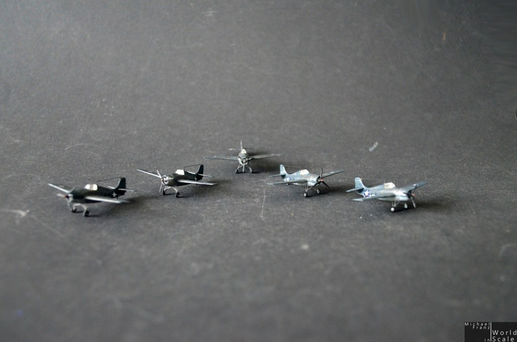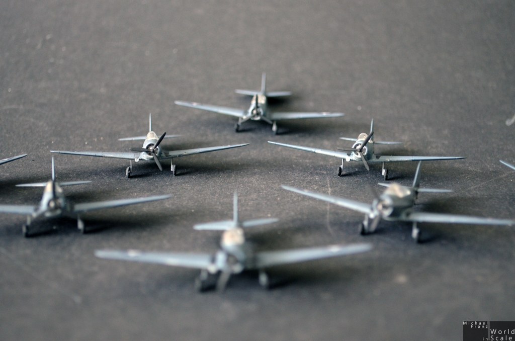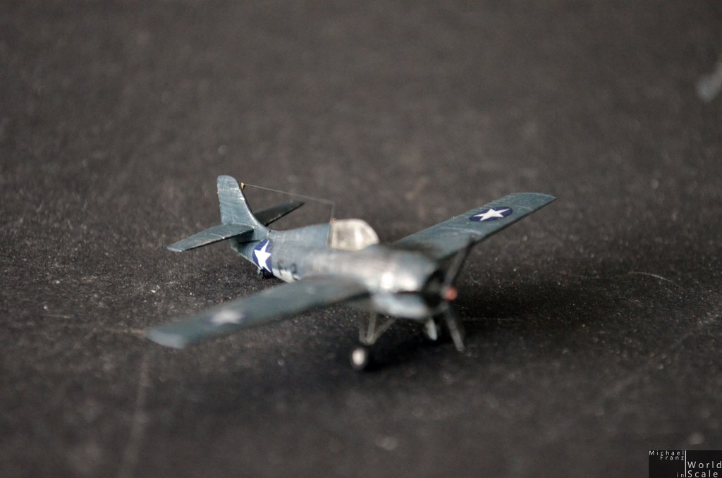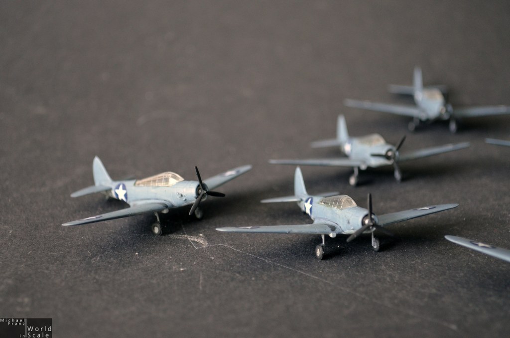 All the TBD-1 and F4F-4 were painted in light grey first, then the different kind of blue upper side is brush-painted. After a layer of clear coat the decals were put on, and the details painted. Finally a layer of matt clear coat on everything. The undercarriage is made of PE-parts by Tetra Models and brush painted after the mounting. Finally all airplanes receive a dark washing with oil paints...