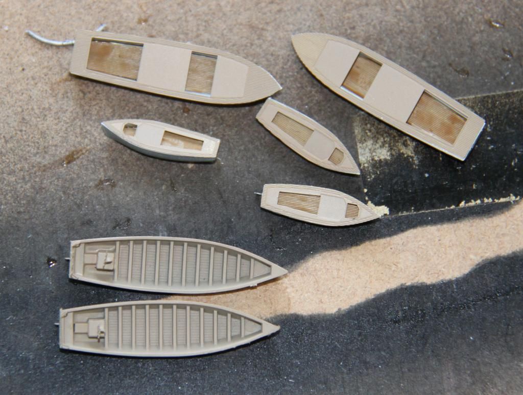 The weather allowed some spraying, boat interiors and decks done, the smaller cabin motor boats look a little hallow in the interior, the interior decks have been washed to bring out the planking, the upper decks haven't, the motor cutter also had their insides sprayed.