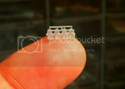 The bells arrived attached to a frame matrix similar to the sprues on injection molded plastic parts. The material ("frosted ultra detail UV cured acrylic polymer") is similar to the polyurethane resin commonly used in model shipbuilding; solid but also easy to work. The shapes are flawless, and the little step artifacts of the layering process are so small as to be virtually invisible. They do, however, make a useful key for paint.