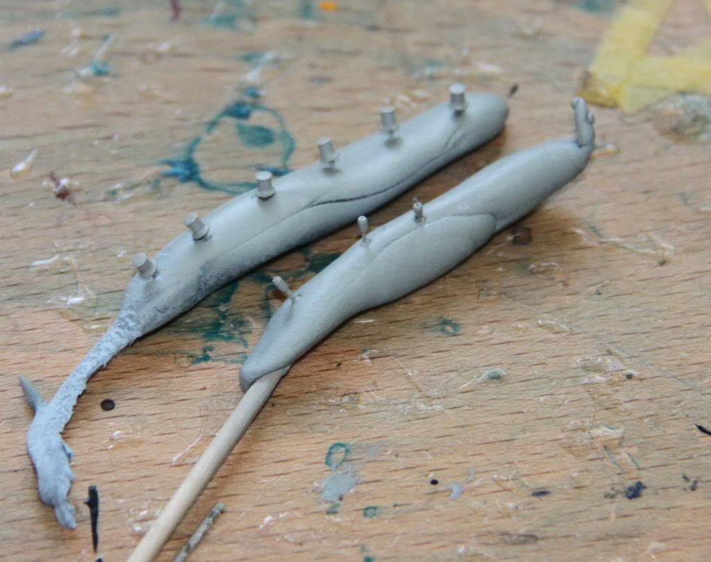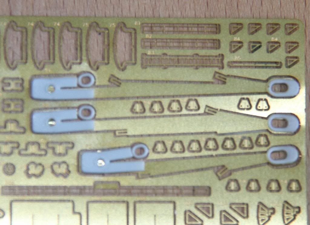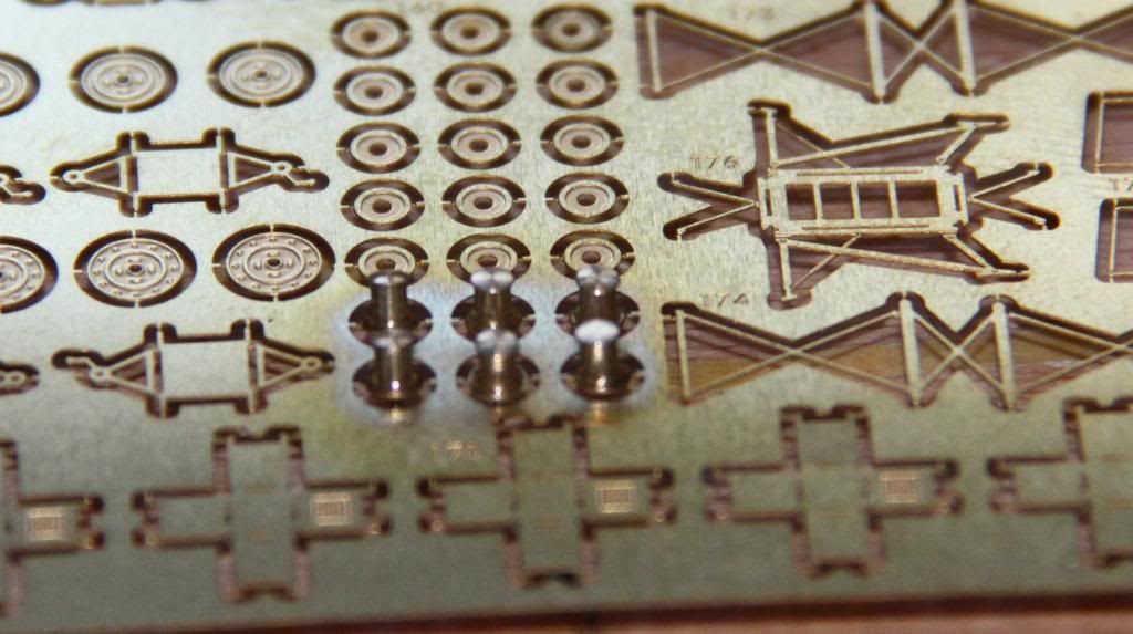 Six moulded on mooring bits that have been removed from the fo'c's'le have replacements provided in the upgrade set, turned brass bits with etched baseplates. The six bits attached to their baseplates, again still on the fret.