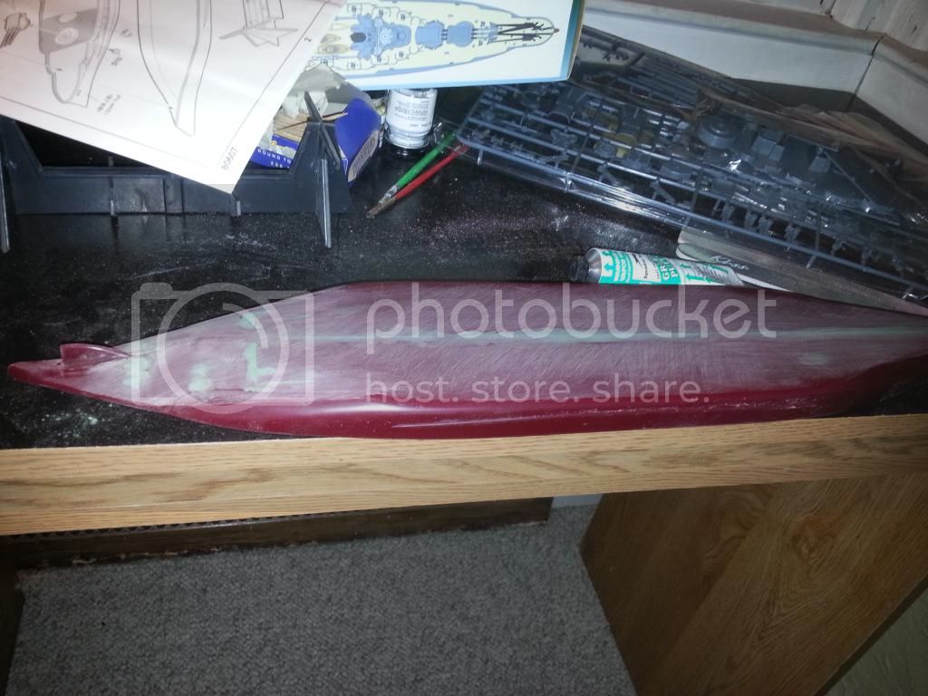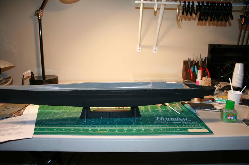 Well we are proceeding slowly but surely. My hull inside was given a bit of weight with some old bullets glued in so it will be less top heavy, and the seam was reinforced to handle the stress of sanding and to make the stand a bit more solid.