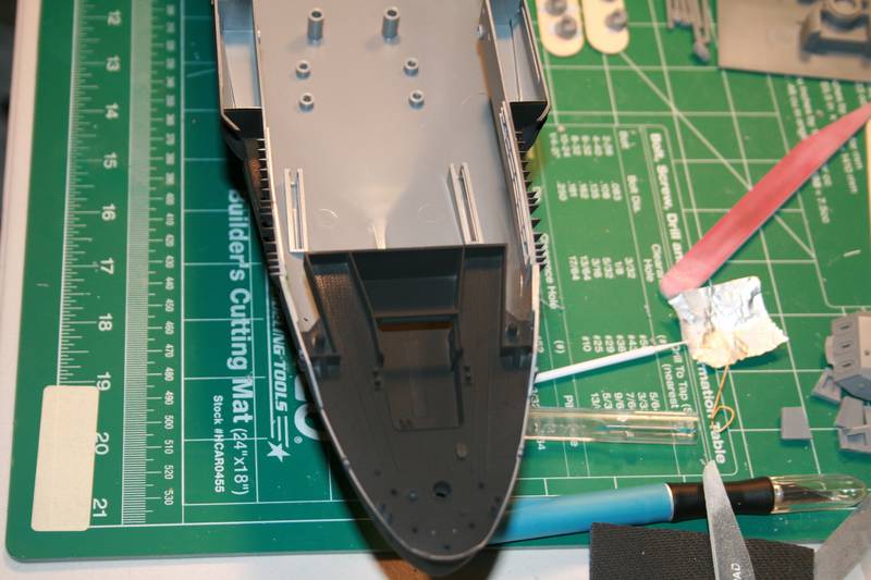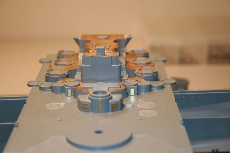 I have also started installing the deck portions. Here I have added the hanger deck to the hull.
