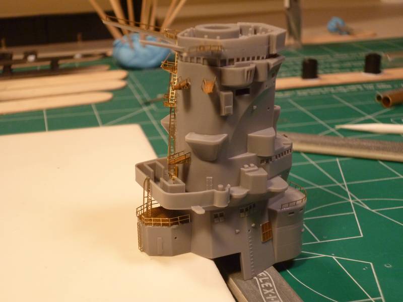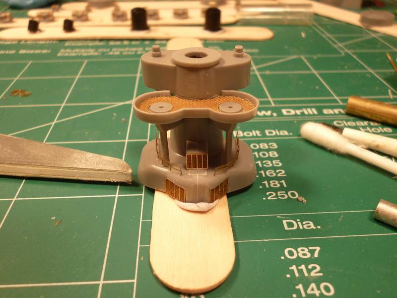 and finally I finished one off the gun directors. The lower railing proved to be challenging as it was not cut to provide for a clear area to bend so I ended up bending it a few times and in the end had to make some slight modifications as I didn't place it correctly. Hopefully priming it this weekend will cover the blemishes that are clearly apparent in the picture.