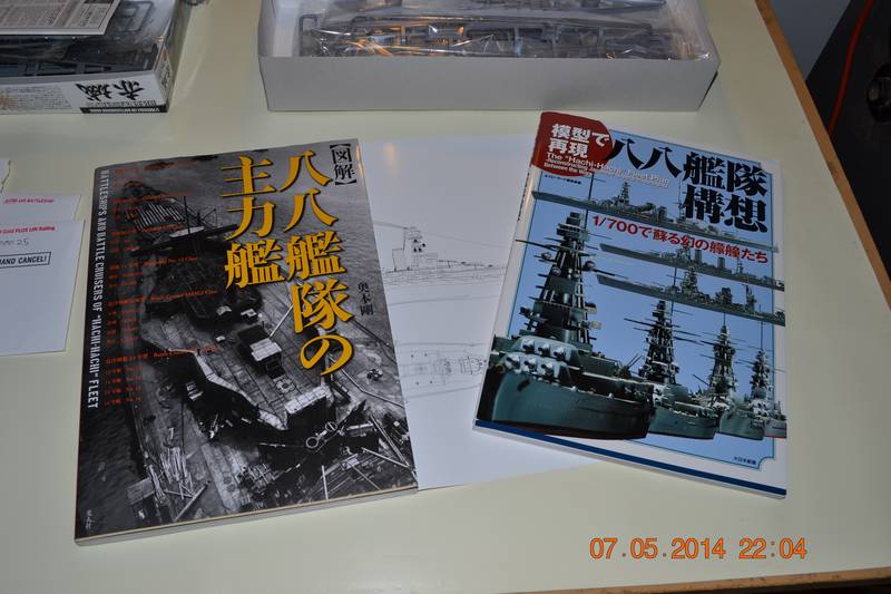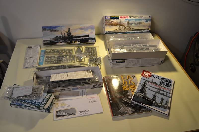 Greetings! This is my first campaign, and I'm getting a late start! The first pic is of a couple of references, both obtained from HLJ. 'Battleships and Battlecruisers of the "Hachi-Hachi" Fleet',and 'The "Hachi-Hachi" Fleet Plan- Reconstructing Japanese Superdreadnaughts Between the Wars" are both Japanese-language publications, IMHO well worth the price due to the excellent photos, tabulated data, and line drawings in the former, and the pics of a wide range of 1/700 builds in the latter. I son't know exactly where this is taking me, but the next pic shows the kits I'll throw into the build- a pair of Fujimi Amagi's and a pair of Aoshima 1927 Nagatos. This sacrifice, no doubt, will spur the Waterline Deities and Murphy to release one or more 8-8 fleet subjects before I finish...
