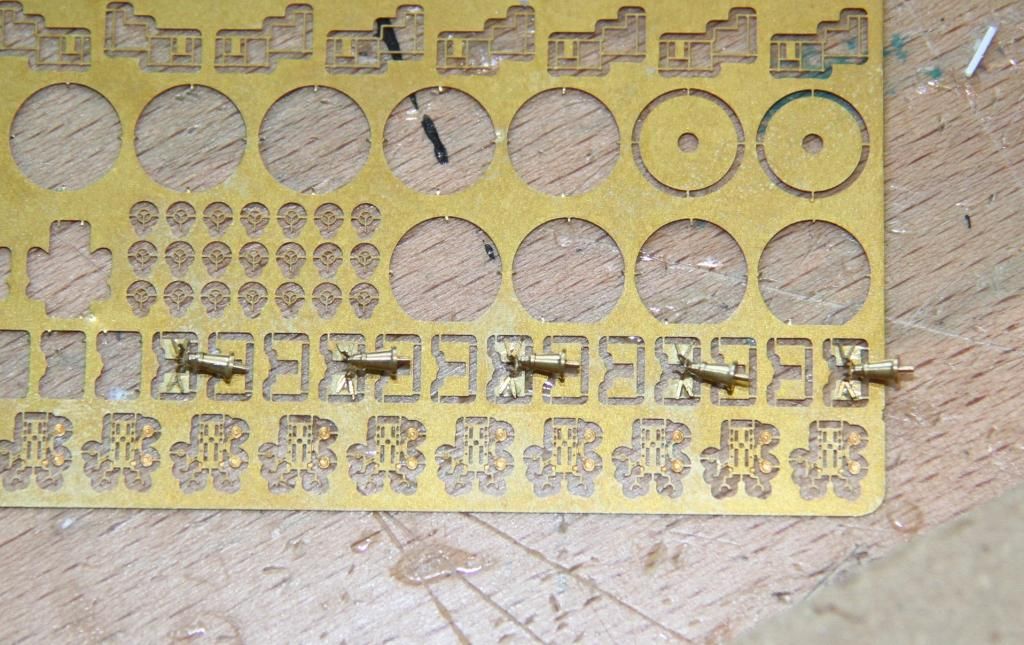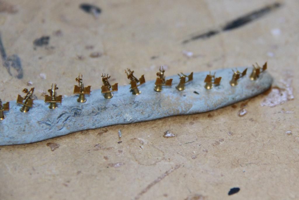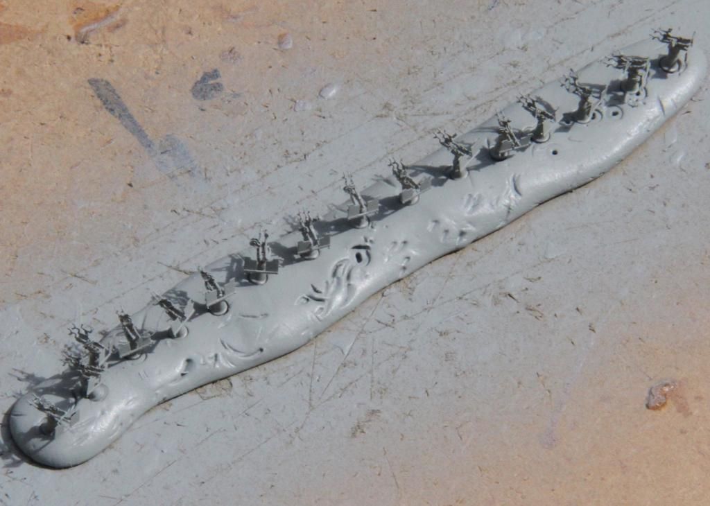 Getting the cradle for the barrels on, the instructions are slightly confusing, and I managed to fold four of the cradles slightly wrong, they still fitted so no real disaster, I shall just hide those guns on the superstructure.