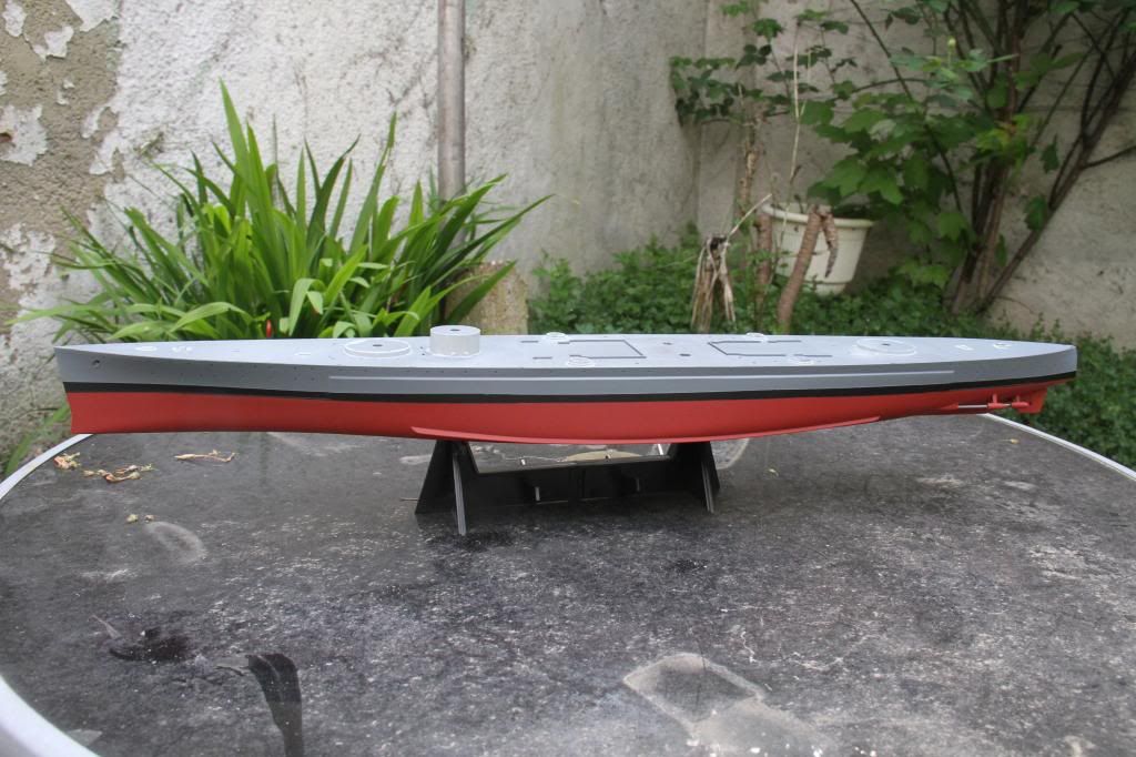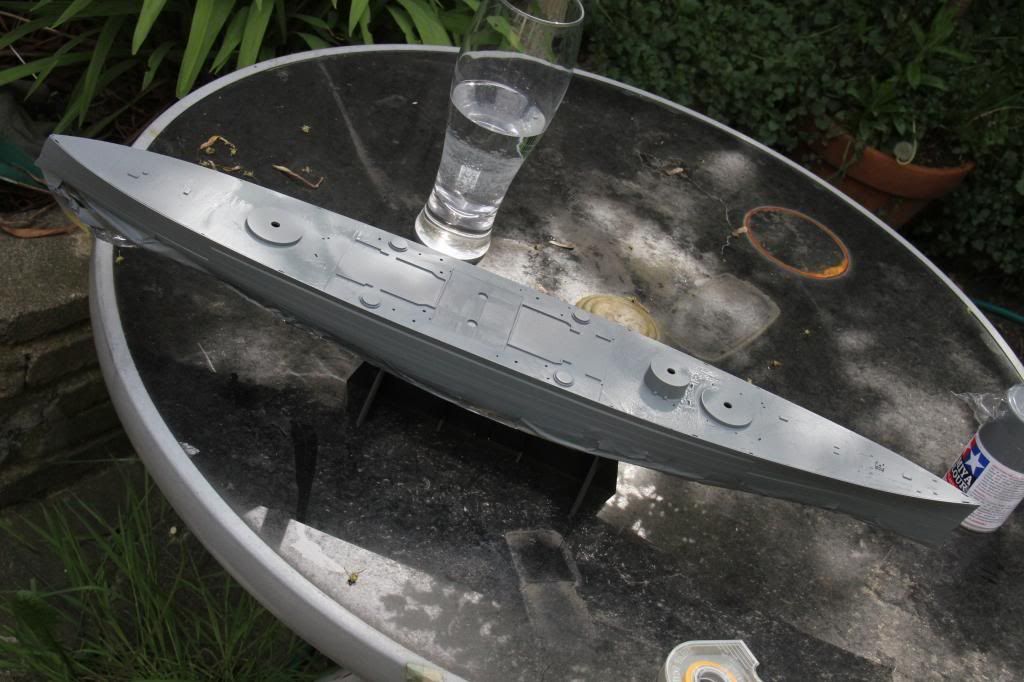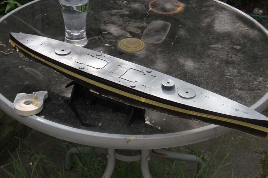 The lower hull masked off and sprayed with Citadel Chaos Black. (I know it looks grey, but it is black, just the light)