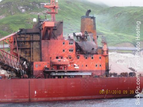 This is a bulkcarrier that had a fire in her steering gear space. A store with paint and chemicals exploded blowing the poop deck up onto the accomodation, (you can see it just next to the funnel). She has since been repaired in Gdansk if I remember correctly and is back at work sailing the seas.