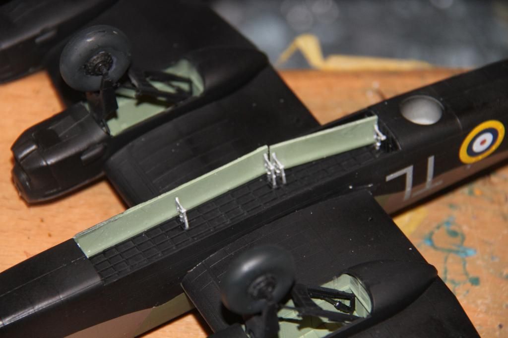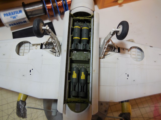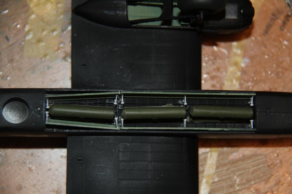 back upside down and fitting the bomb doors, one side done, they did need quite a bit of fettling to fit. Each door needs cutting in two, down the an engraved line two thirds of the way aft, but they still need the be filled back a bit to ft.