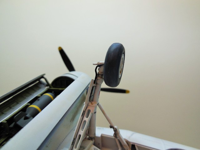 Hi guys, I accomplished a lot on the build over the past couple of days, finishing all the general construction. The fit of the wings and tailplane were excellent and only a very small amount if filler was needed in a couple of places. I don't normally construct the undercarriage until near the end of a build, but in this case I modified the brake line with a small scratch build and had to put the landing gear in place to make sure I got the part built right. I sprayed the plane with Alclad II white primer and it went down very smoothly; and since the primary color of the aircraft I am representing is white I managed to kill two birds with one stone. The Dark Gull Grey is Tamiya's XF-54. Both colors went on very smoothly and I debated whether to gloss coat the bird, but decided to do so in the end. The gloss coat is Alclad's Aqua Gloss, the first time I have used it. It did a good job covering smoothly; I wanted a satin finish and managed to get one. Decals will go on next, followed by weathering.