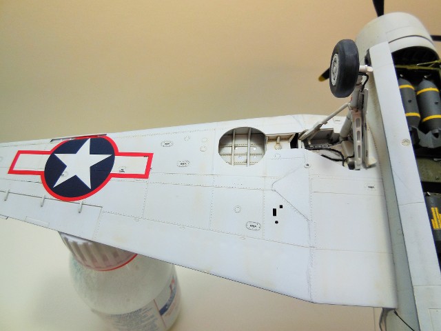 Thanks for the kind comments guys. I have been getting to spend a lot of time at the bench; so I'm progressing much more rapidly on this build then normal. The following photos show the plane decaled and than with about 75% of the weathering complete. I am trying out a line of weathering medium from True Earth to replicate the splotchy fading that carrier aircraft often exhibited and for the pin wash that I'll get to today. I airbrushed the medium, which is a water based glaze onto the aircraft, laying down the fading first followed by general weathering. It turned out ok, but like all new techniques I need to practice to improve the process. Unfortunately, the weathering does not show up well in the photos; I will see if I can take some better shots when I have finished the builds.